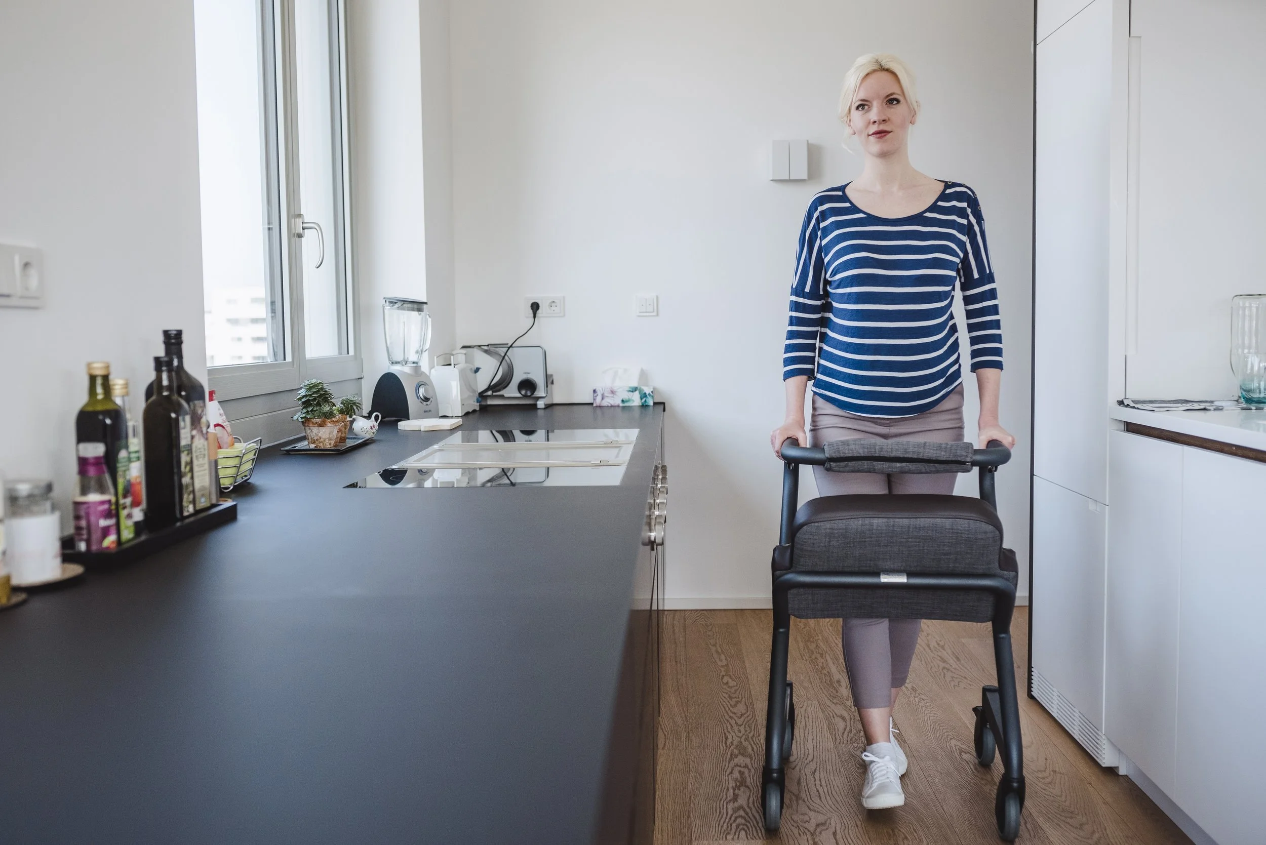 Die nächste Herausforderung ist die Breite der Türstöcke. Insbesondere bei Altbauwohnungen sind die Türstöcke teilweise weniger als 80 cm breit. Ein herkömmlicher Rollator passt da nicht durch.